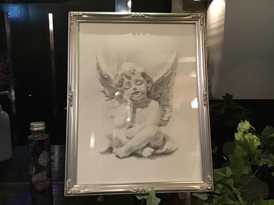 7月13日にプレオープンしたのですが、6月中はスタッフ共々準備でてんてこ舞いでした。そんな中お願いして女神のAnankeさんを描いていただいたのですが、「天使」も追加でお願いしちゃいました。ドローイングだそうです(^^)